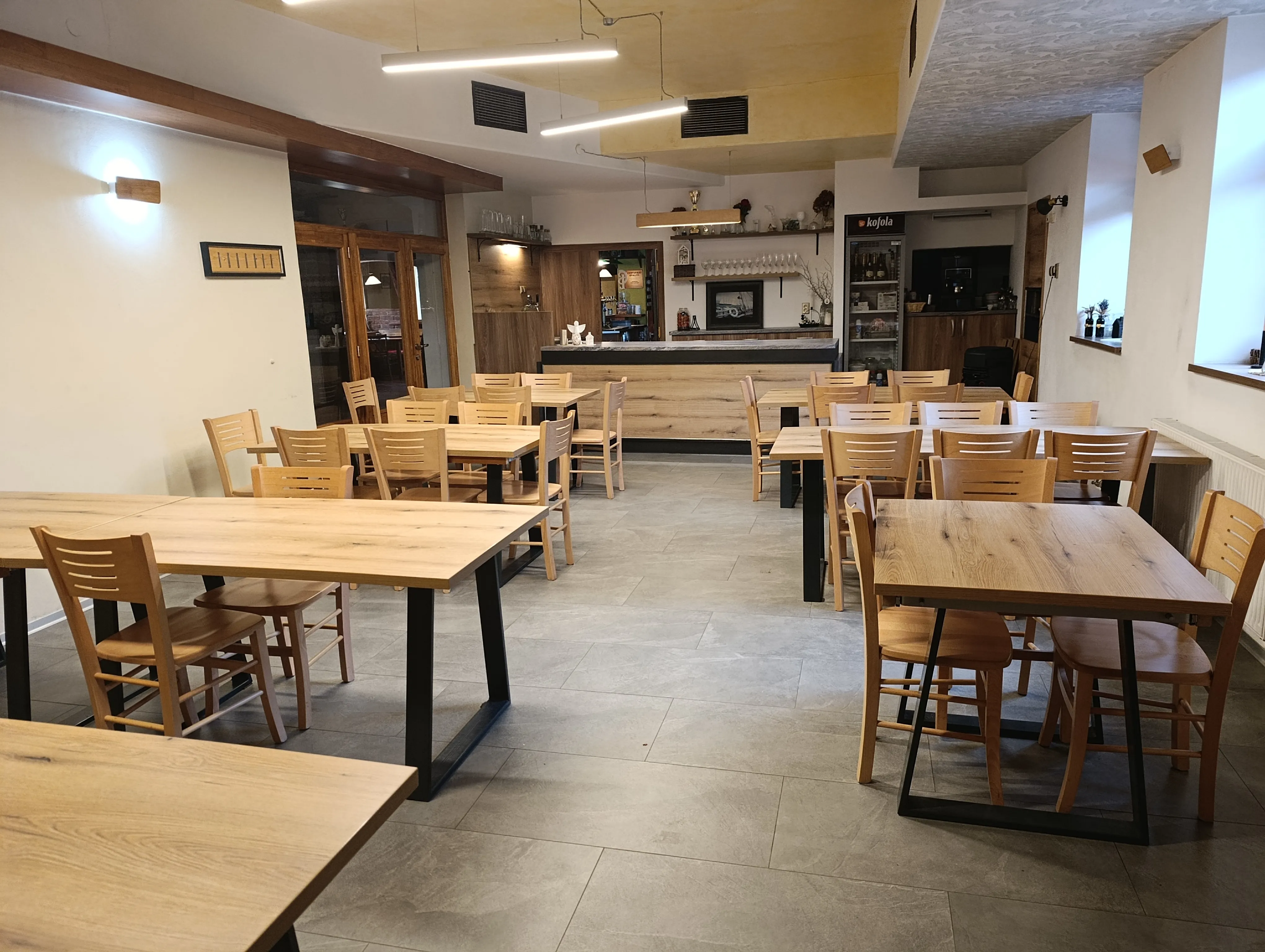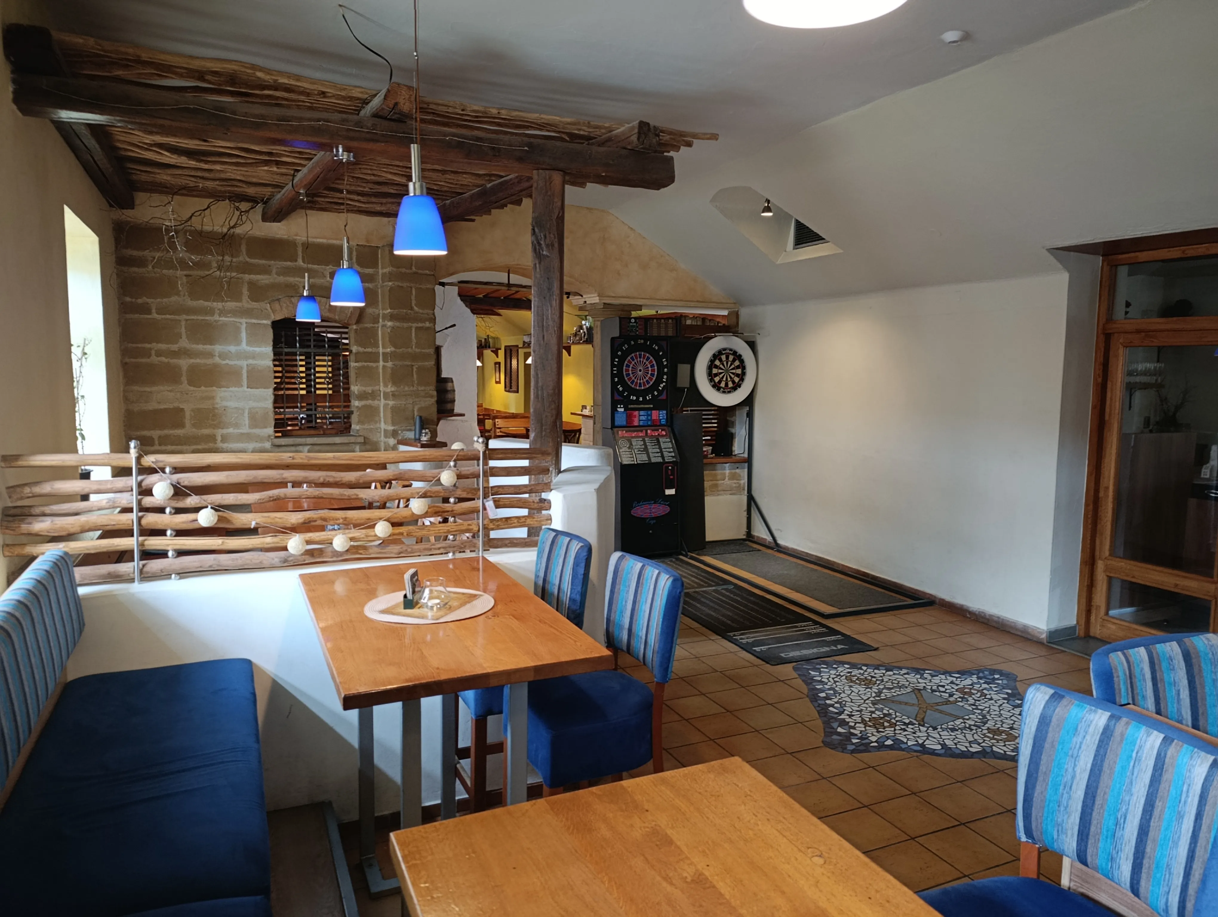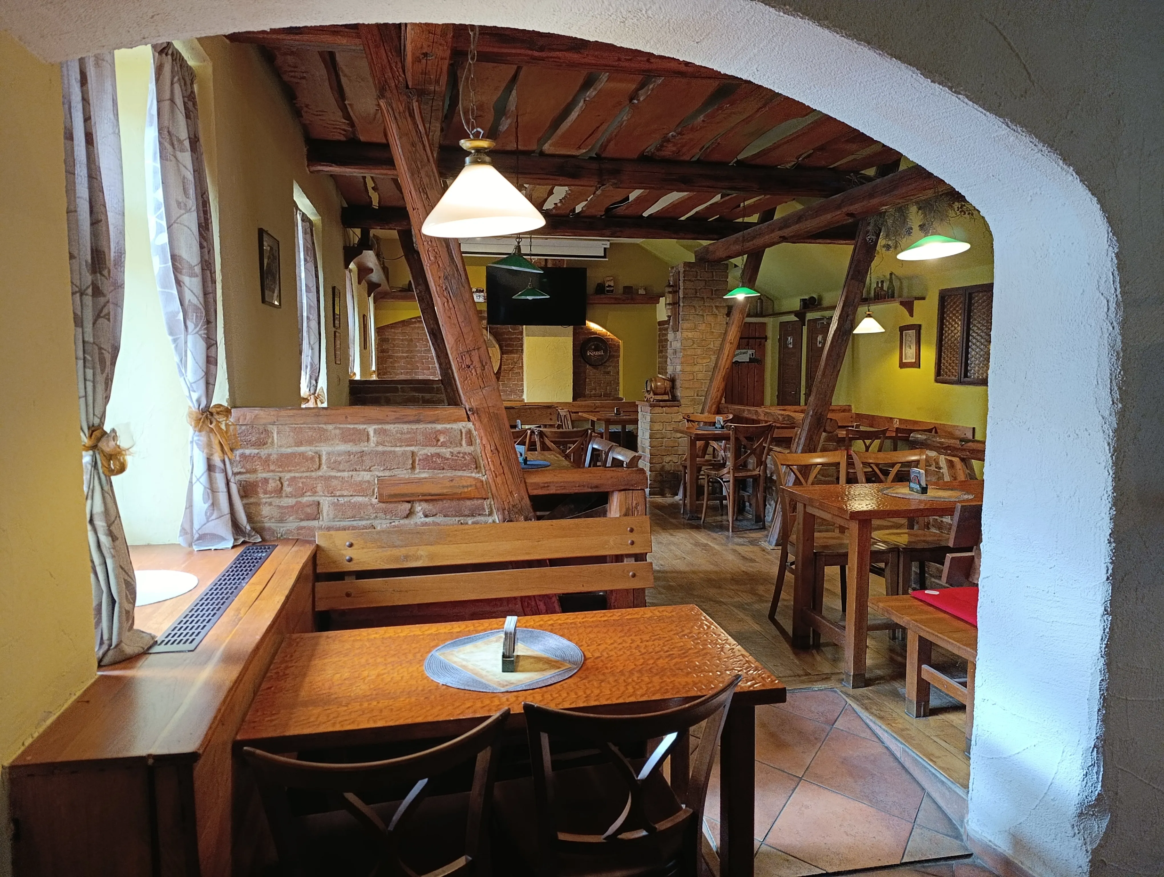 Interiér v rustikálním stylu s odkrytými trámy, cihlami a dřevěným nábytkem vytváří domáckou, pohodovou atmosféru. Při posezení u nás zapomenete na shon všedního dne a užijete si klid, dobrou náladu a přívětivou obsluhu.