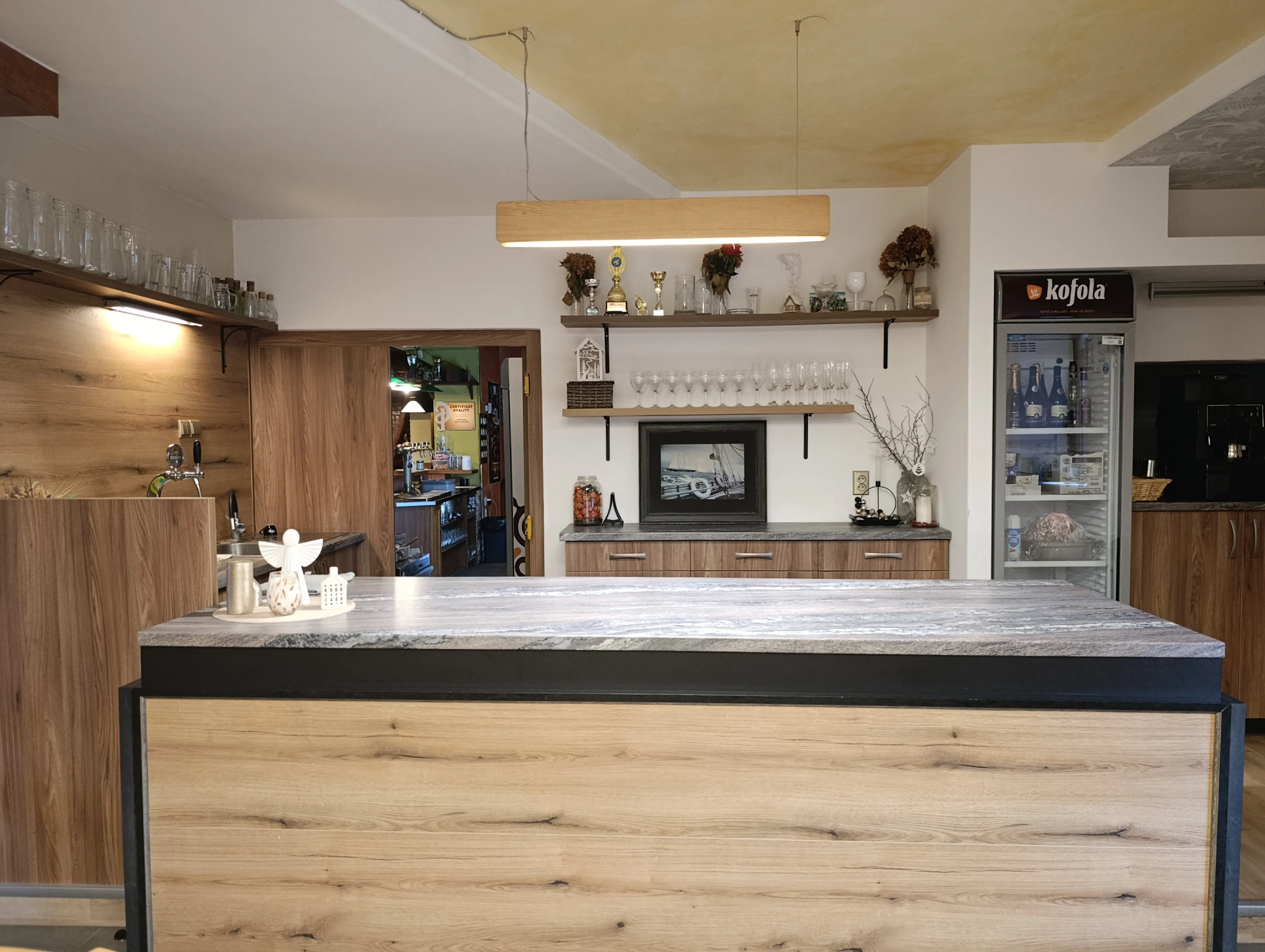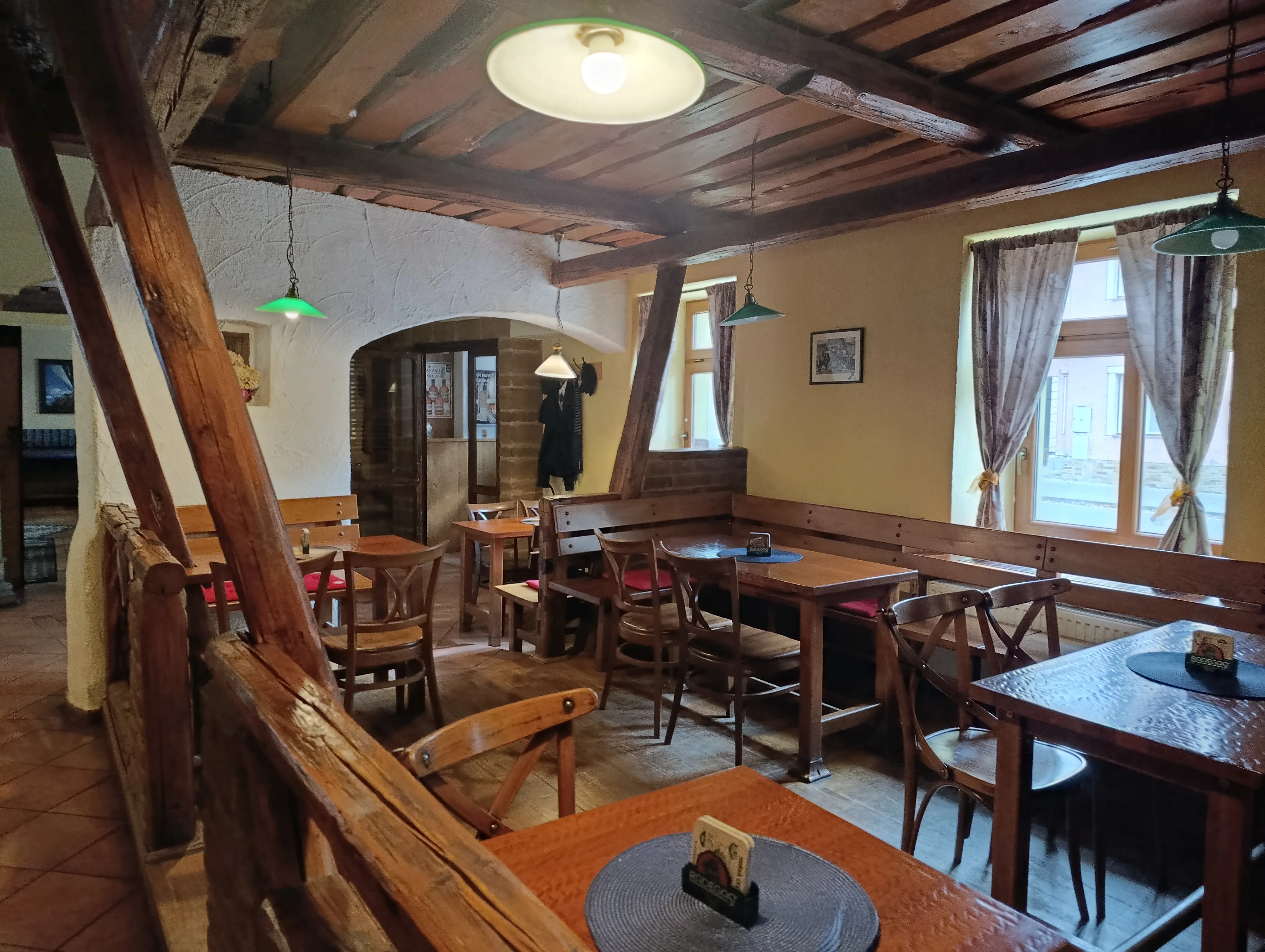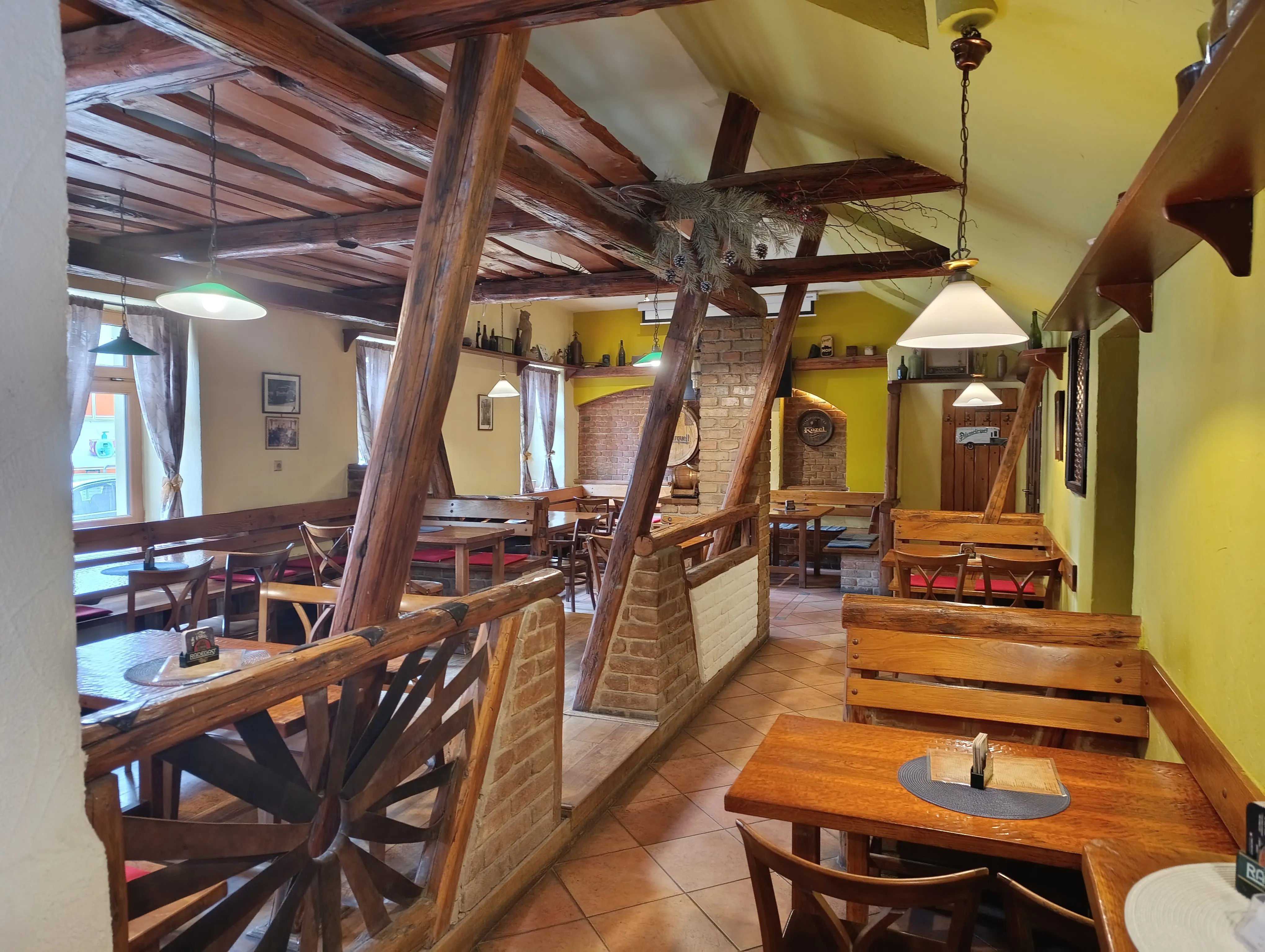 Interiér v rustikálním stylu s odkrytými trámy, cihlami a dřevěným nábytkem vytváří domáckou, pohodovou atmosféru. Při posezení u nás zapomenete na shon všedního dne a užijete si klid, dobrou náladu a přívětivou obsluhu.